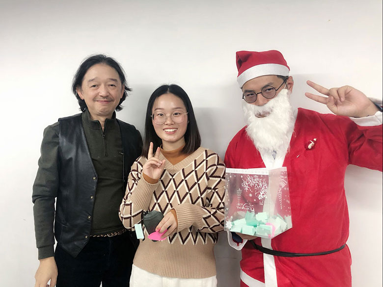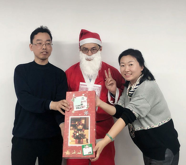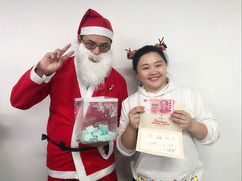 圣誕節(jié)的主角當(dāng)然是圣誕老人啦!猜猜這位白胡子老爺爺是誰(shuí)?哈哈,或許你猜對(duì)啦,他是策劃設(shè)計(jì)部的平面設(shè)計(jì)師連偉,也是在圣誕節(jié)前一天過生日的12月壽星。感謝圣誕老人和我們?nèi)肆Φ男〗憬阋黄?,為大家的歡聚活動(dòng)服務(wù)!